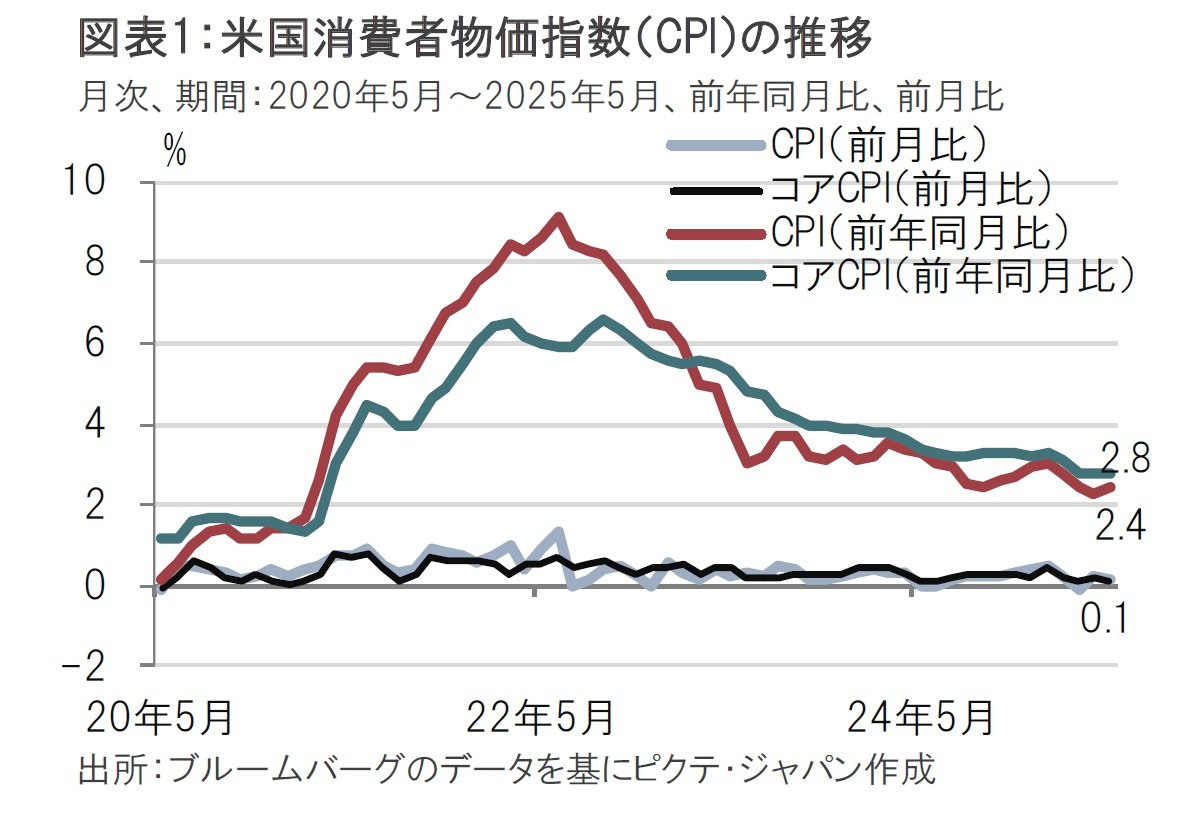 米労働省が6月11日に発表した5月の消費者物価指数(CPI)は前年同月比で2.4%と、市場予想通りで、前月の2.3%上昇を小幅ながら上回った(図表1参照)。一方で、物価の瞬間風速を映す前月比で0.1%上昇と、市場予想の0.3%上昇、前月の0.2%上昇を下回って鈍化した。足元の物価上昇圧力が弱いことから、トランプ米政権の高関税政策の影響は明確には示されなかった。