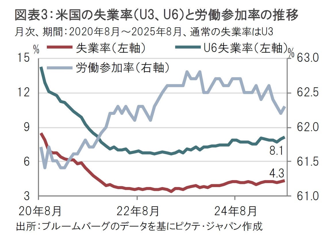 8月の失業率(U3)は4.3%(4.324%)とじり高傾向が確認された(図表3参照)。4.3%という水準は米連邦準備制度理事会(FRB)の長期見通しである4.2%と大差ないことや、FRBの25年(10-12月期)の見通しである4.5%を下回っているから堅調な水準という見方が市場の一部にある。もっとも、足元の失業率の解釈には何点か注意も必要だ。