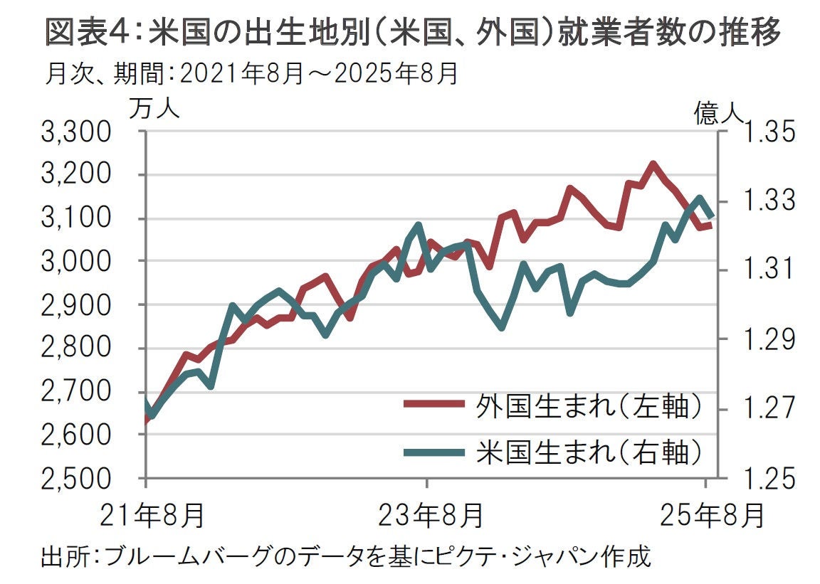 8月の労働参加率は62.3%と前月を上回ったが、依然低水準だ。労働参加率の低下は労働市場からの退出など質の悪化を示唆する傾向がある。今後も注視が必要だろう。労働参加率が低下した背景はトランプ政権の移民政策で不法移民の多くが労働市場から離脱したことが大きいと考えられている。米国の就業者を出生地別に分けてみても海外生まれ(移民に相当)の就業者数の減少からも明らかだ(図表4参照)。
