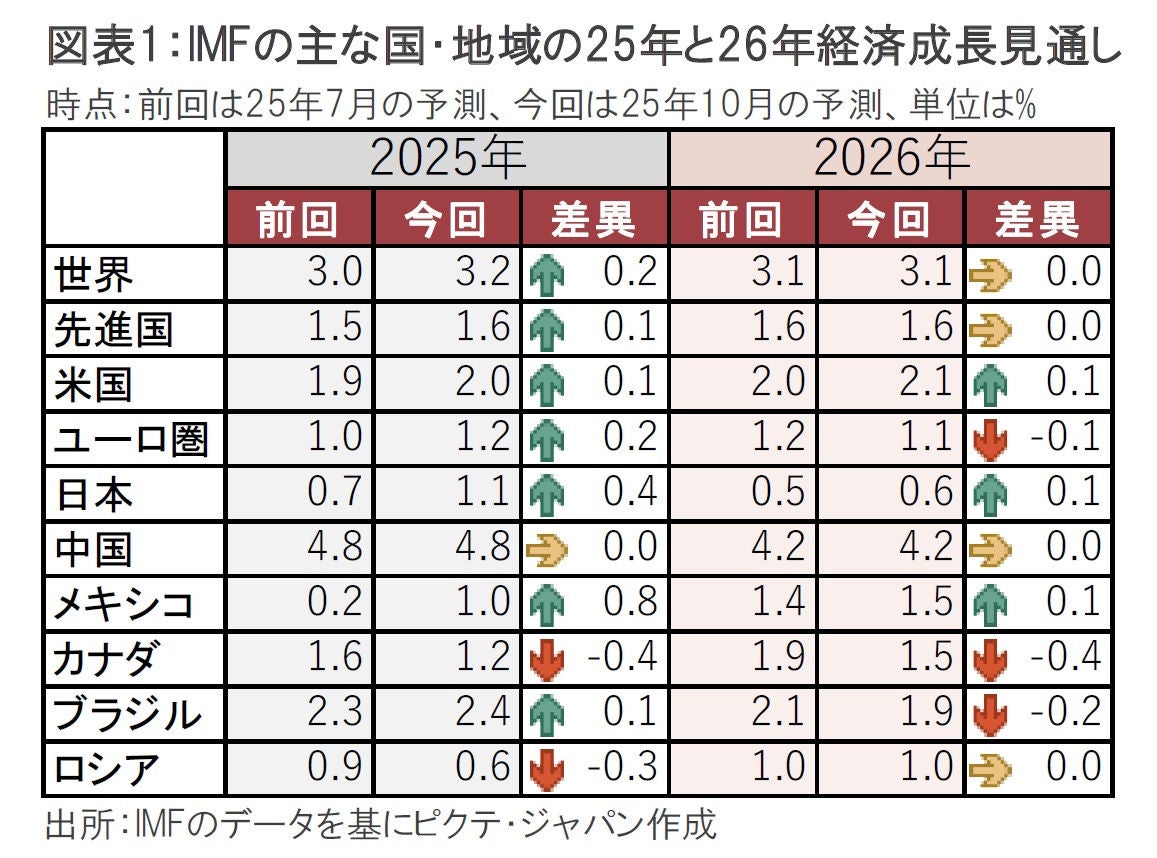 国際通貨基金(IMF)は10月14日、四半期に1度の世界経済見通しを公表した(図表1参照)。IMFは25年の世界経済の成長率見通しを3.2%とし、前回(7月見通し)から0.2%上方修正した。26年については3.1%で据え置いた。米国が4月初めに相互関税を発表した後の4月見通しでは25年の成長率を2.8%(1月見通しから0.5%の下方修正)としたが、7月、今回の見通しで合計0.4%上方修正された。
