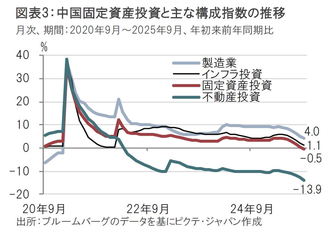 固定資産投資は9月が年初来前年比で0.5%減とマイナス圏に落ち込んだ(図表3参照)。不動産投資は依然として低迷しており、押し下げ要因となっている。そのうえ、製造業やインフラ投資も鈍化傾向で、9月はともに前月の伸びを下回った。