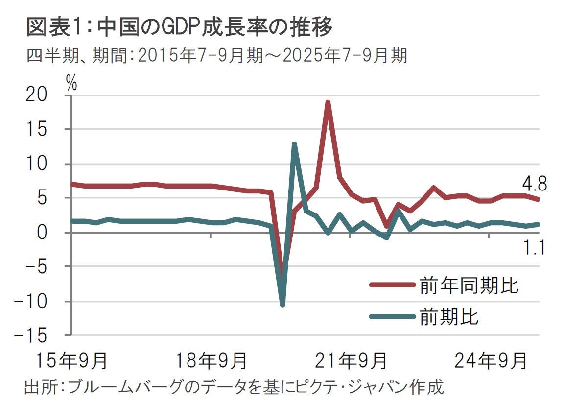 中国の7-9月期GDP成長率は前年同期比4.8%増と市場予想を上回ったが、前期から減速した。補助金による消費に買い疲れが見られ、若年層の高失業率や米中関係悪化への懸念が消費を抑制した可能性がある。外需は堅調だが、対米輸出は低迷し不安は残る。固定資産投資は不動産投資が低迷続きで、製造業にも陰りが見られる。こうした中、中国政府の15次5ヵ年計画での対応に注目したい。