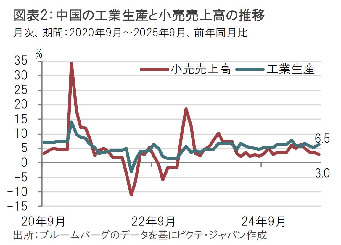 一方、9月の工業生産は、市場予想、前月を上回り堅調だった。中国の9月の輸出の伸びが前年同月比で8.3%増と、8月の4.4%増を大幅に上回り堅調だったことが生産活動を支えたと見られる。工業生産の中身を見ると、ガラスやセメントなど建設関連は軟調なままだが、堅調な外需を受け産業AI機器や、新エネルギー車、一部の機械は好調を維持している。