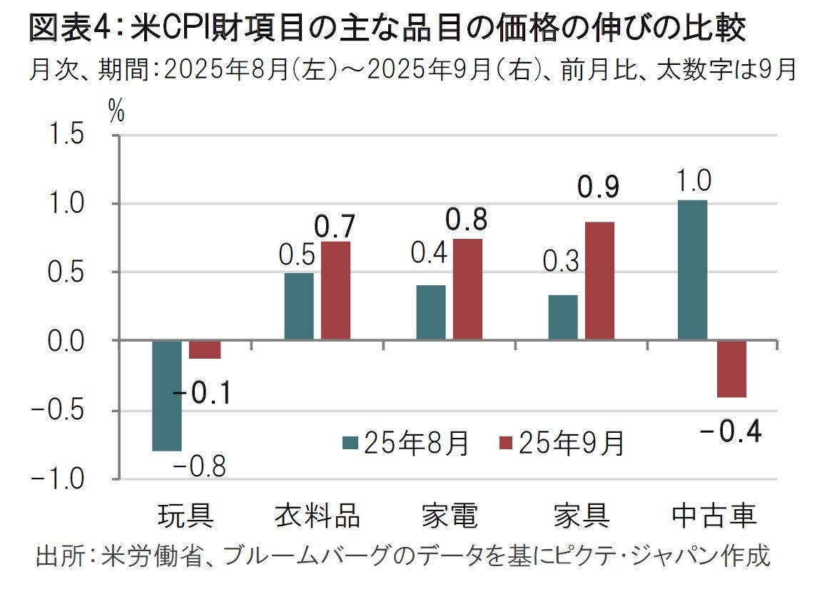そうした中、米国が海外からの輸入に依存する商品である玩具、衣料品、家電、家具などは8月に比べ9月の伸びが加速した。関税による価格押し上げの影響が想定される。もっとも、価格転嫁のタイミングは品目、企業により差がある。関税前の駆け込み輸入在庫に違いがあること、企業業績が好調な企業は価格転嫁を抑えているケースもあるなど要因は様々で関税の物価への影響を特定することは困難だ。そうした中、9月の財の品目の中に関税の影響が見られることは、物価上昇圧力への警戒を維持する必要性が示唆されている。