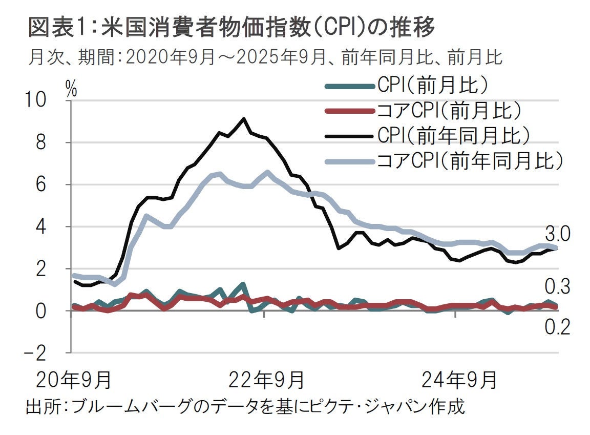 米労働省が発表した9月の消費者物価指数(CPI)は、前年同月比・前月比ともに市場予想を下回り、物価上昇圧力は限定的であることが示された。ただし、エネルギーや食品を除くコア指数が鈍化したのは住居費の減速などが大きな要因だった。一方で、関税の影響が一部品目に見られ、物価上昇圧力への懸念は残る。年内の利下げは支持されるが、来年の追加利下げは物価動向を見守る必要がある。