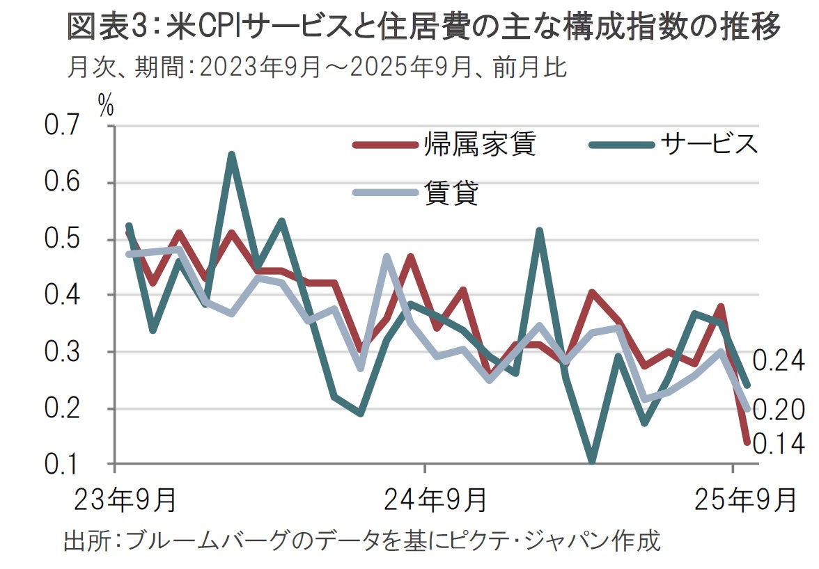 サービスは9月が前月比0.2%上昇(小数点以下2位では0.24%)と8月の0.3%上昇から鈍化した。しかし、鈍化の主因は構成割合の大きい住居費の減速の影響が大きい(図表3参照)。