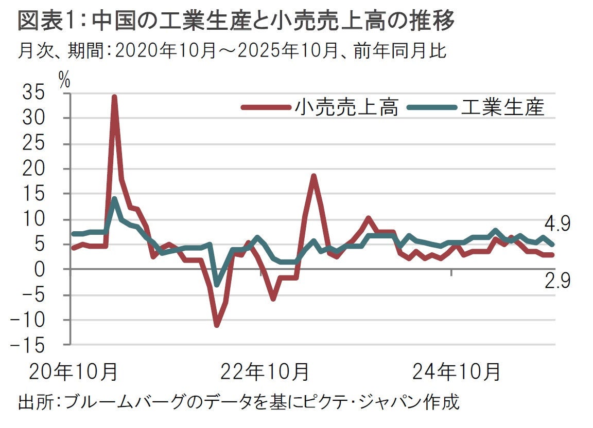 中国国家統計局は11月14日に10月の主要経済指標を発表した。消費動向を示す小売売上高は前年同月比2.9%増と、市場予想の2.8%増を上回ったものの、9月の3.0%増を下回るなど内需の弱さが示された(図表1参照)。