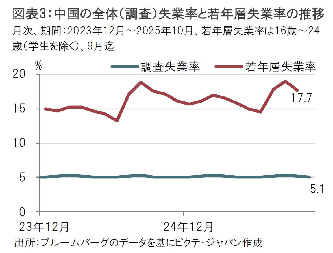 中国の10月の全体の失業率は5.1%と低水準だが、実態を反映しているとは思えない。注目すべきは若年層の失業率で9月分は17.7%と高止まりしている(図表3参照)。8月の18.9%からは小幅改善したが、10月分の結果に注意が必要だ。