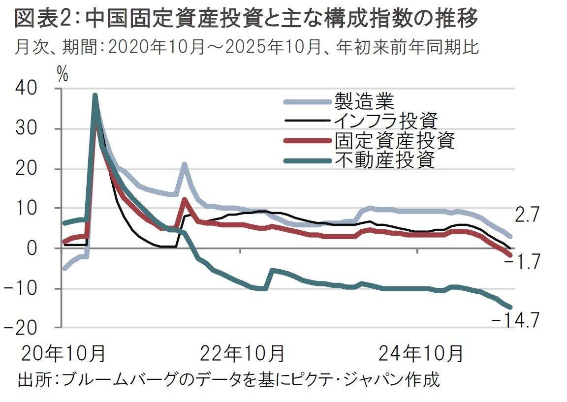 10月の固定資産投資は年初来前年同期比1.7%減と市場予想の0.8%減、9月の0.5%減を下回り、マイナス幅を拡大させた(図表2参照)。