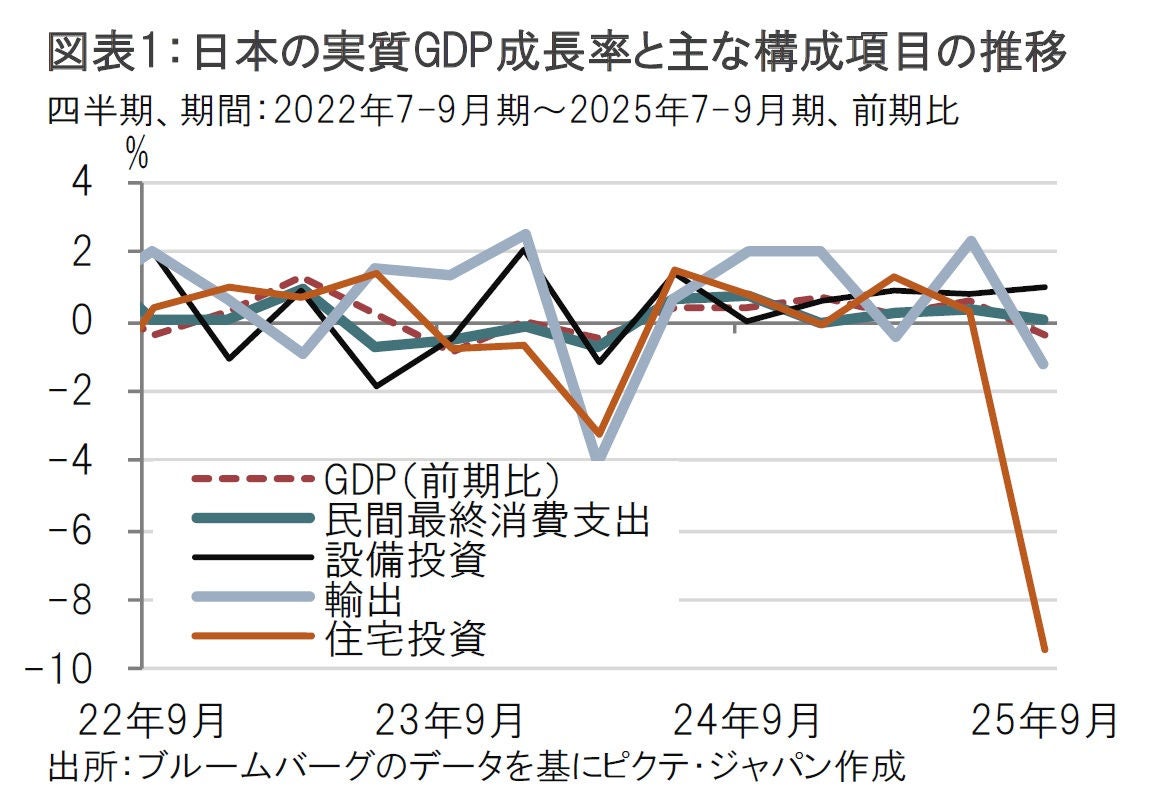 日本の7-9月期のGDP成長率は6四半期ぶりにマイナスとなった。しかし、主な下押し要因は輸出と住宅投資の不振で、ある程度の悪化は市場にとっては織り込み済みだったと思われる。むしろ、前期比の成長率は市場予想ほどには悪化していない。個人消費や設備投資などは底堅いと評価も出来ると思われる。