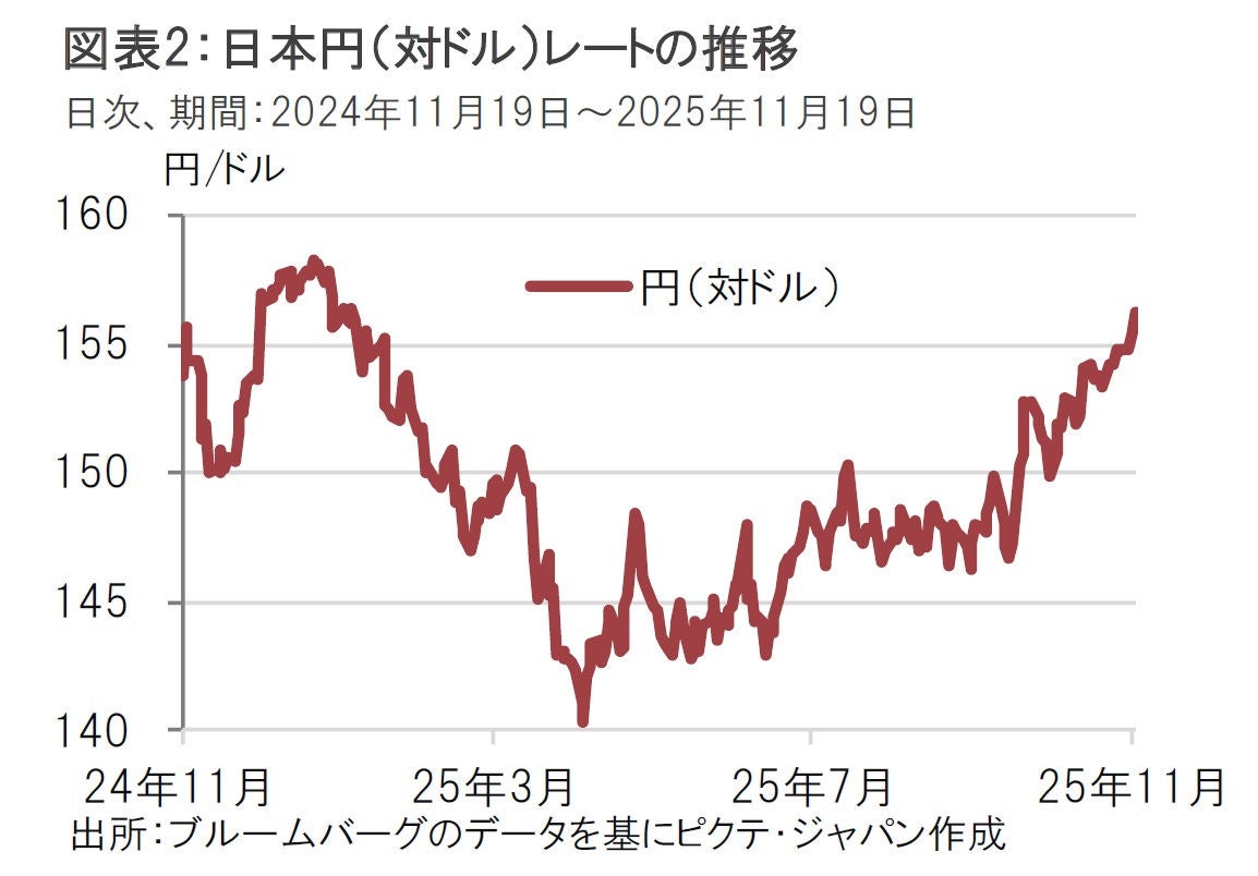 しかし、さりとてマイナス成長だ。タイミングが良いのか、悪いのか政府は総合経済対策の検討を進めている。与党自民党の有志による「責任ある積極財政を推進する議員連盟」は18日、経済対策の裏付けとなる補正予算の規模を25兆円とするよう高市早苗首相に求めたとの報道もある。そうした中、日銀の追加利上げ見通しも後退し、為替市場では円安が進行している(図表2参照)。