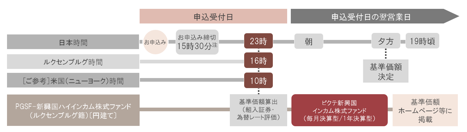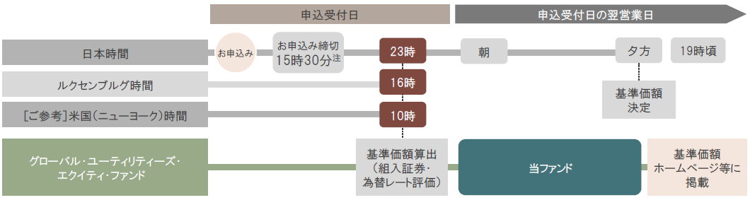 ルクセンブルグ時間の16時(日本の23時(冬時間は24時)、ニューヨークの10時)の組入証券と為替レートが、ファンドの基準価額に反映されます。
